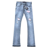 DENIMICITY RIP AND REPAIR GREY WASH WITH PINK STITCH STACKED JEANS
